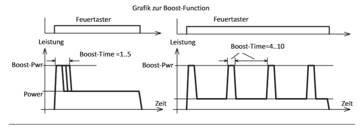 Elle permet d'activer une augmentation temporaire de la puissance (boost) au-delà de la puissance réglée, jusqu'à la valeur définie dans Boost-Power. En plus des différentes durées de boost, il y a d'autres options sous forme de boost périodique, c'est-à-dire d'autres boosts à différents intervalles. Le boost initial sert à chauffer rapidement la résistance. L'augmentation répétée de la puissance fait que la résistance passe constamment par une certaine plage de température. Dans ce cas, les différents arômes de l'e-liquide, qui se développent à différentes températures, sont plus faciles à goûter.